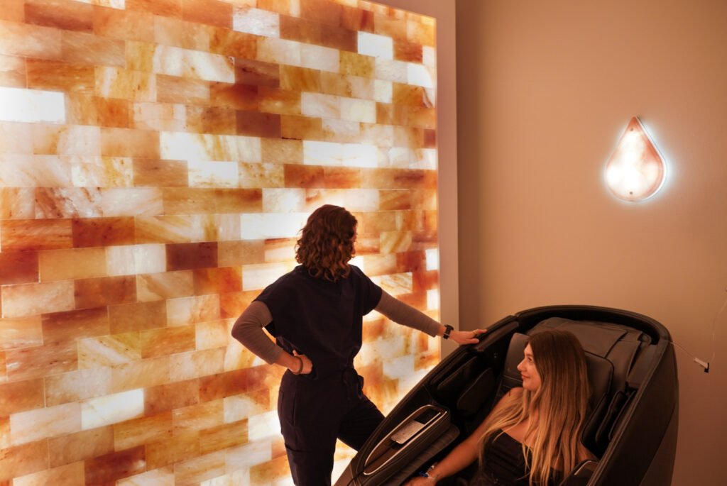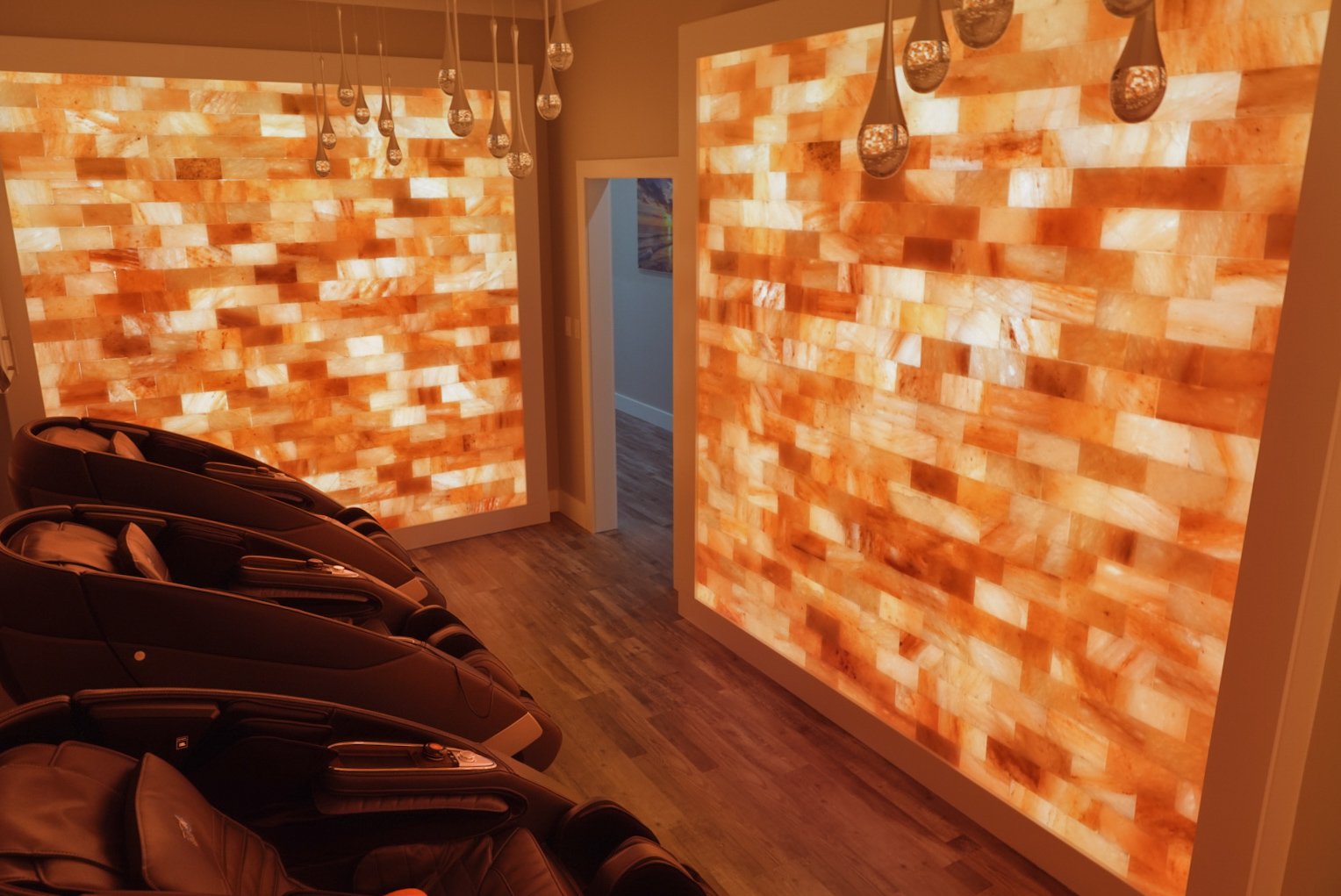Unwind in our soothing relaxation lounge, surrounded by Himilayan salt walls, designed for your comfort and peace. Enjoy complimentary wellness water and aromatherapy hot towels.